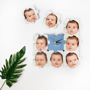 Make funny custom clock out of a jigsaw puzzle with 9 pieces. Customize with your artwork, photos, and text. Easy to unassemble & reassemble.